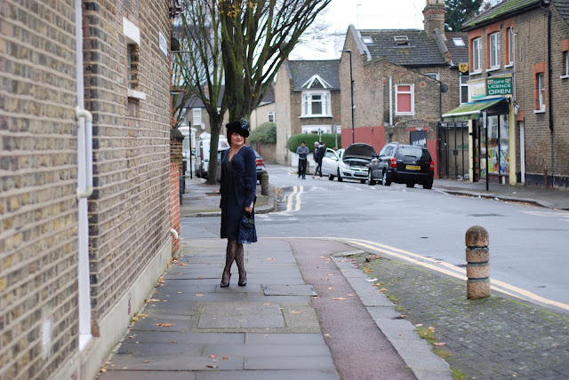 Całość podkreślona retro wisiorem i torebeczką z pawiem. Sukienka też już występowała z cekinowym beretem i było to dwa lata wstecz, mam ją do dzisiaj, bo należy do moich ulubionych.
